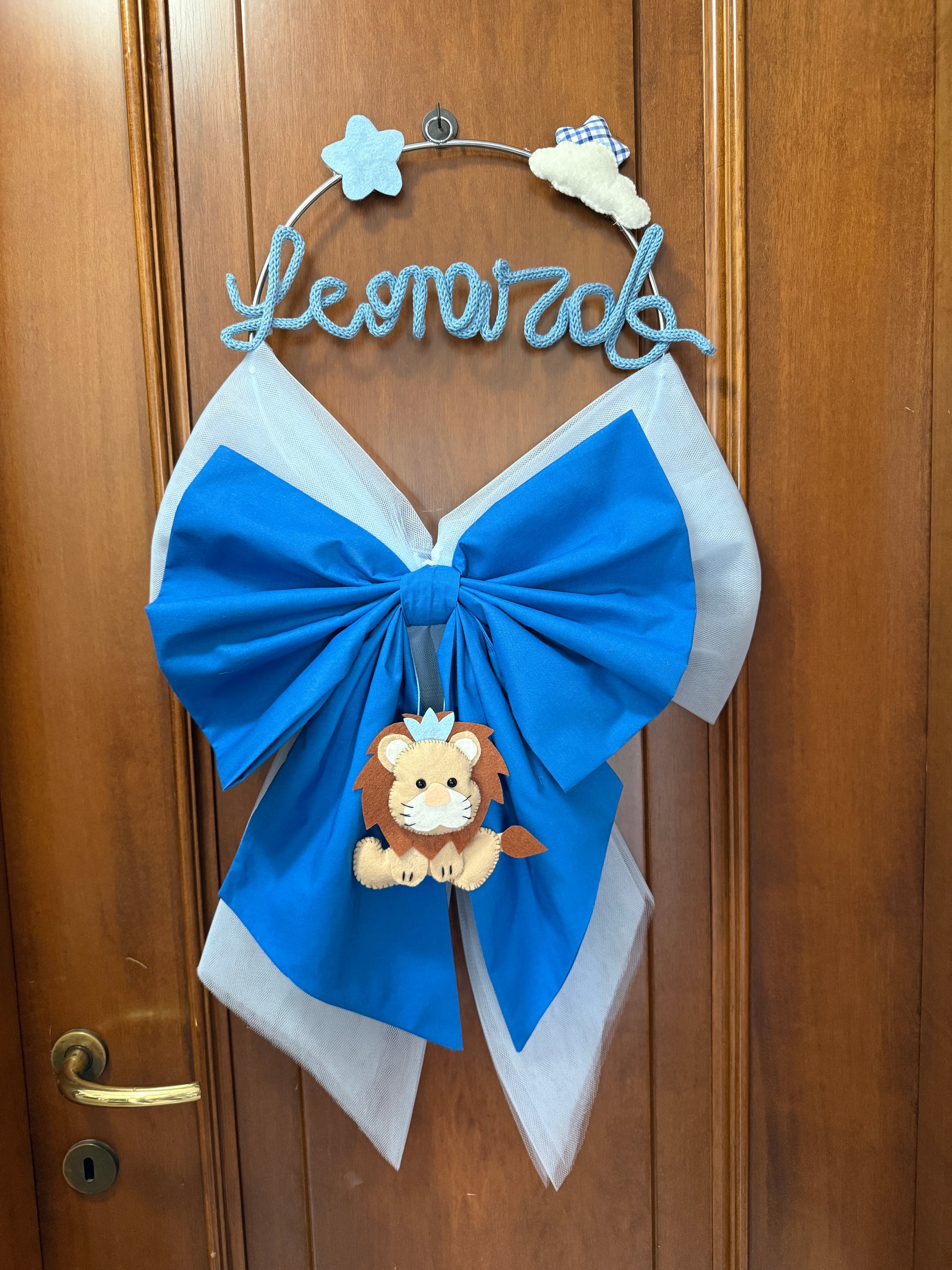 Un fiocco grande, elegante e pieno d’amore: Ruggito di Gioia celebra la nascita con un mix perfetto di tulle vaporoso, stoffe delicate e un dolce leone appeso, pronto a custodire ogni sogno del neonato.
