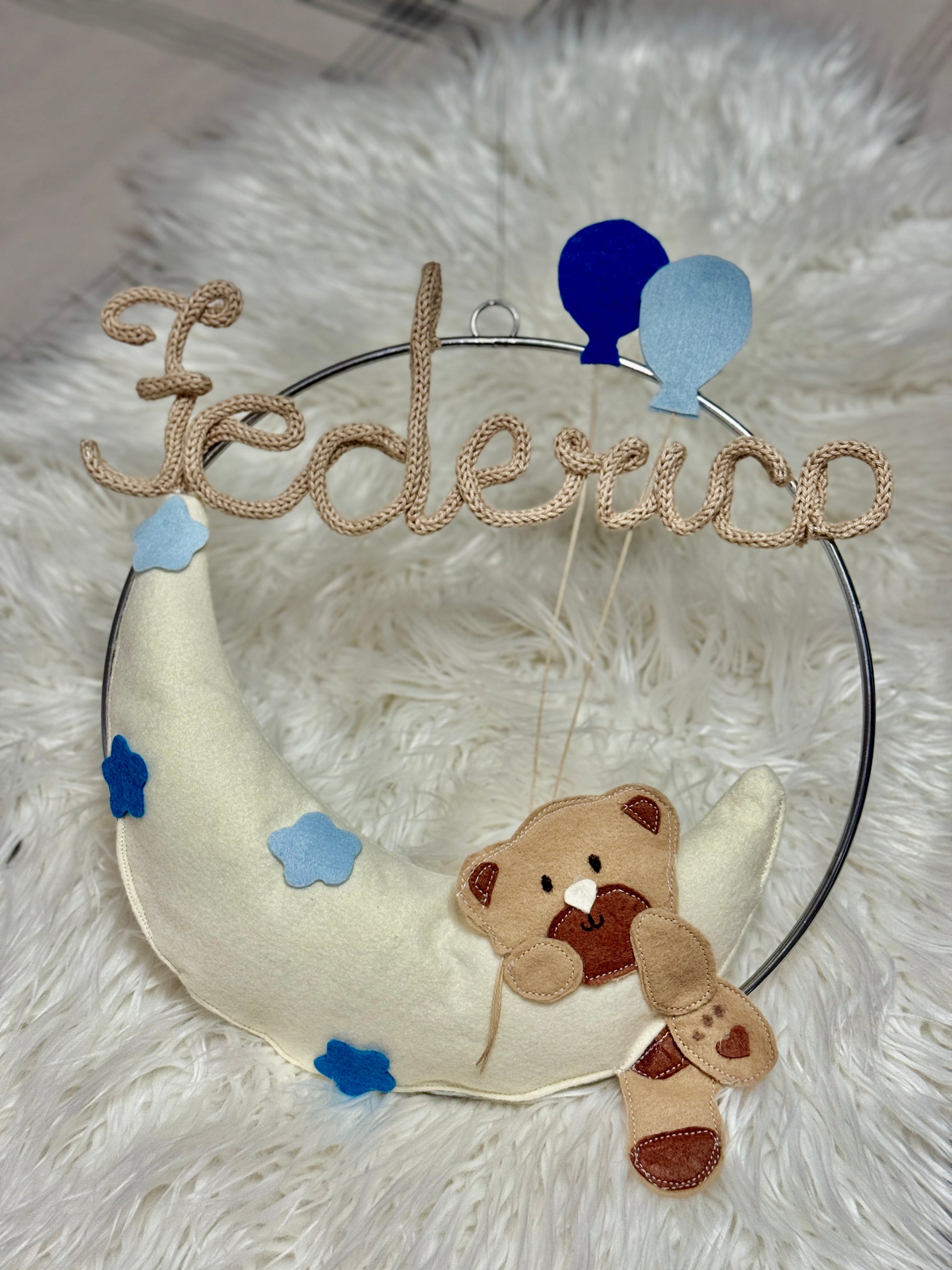 Creato a mano con amore e attenzione ai dettagli, Sogni di Luna è il fiocco nascita ideale per chi desidera annunciare una nuova vita con dolcezza ed eleganza. La luna in tessuto accoglie un orsetto sognante, simbolo di affetto e calma, per dare il benvenuto al neonato in un mondo fatto di coccole e luce soffusa.