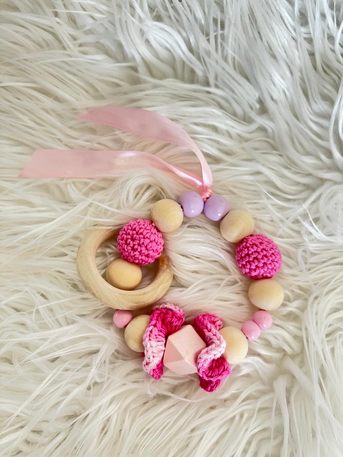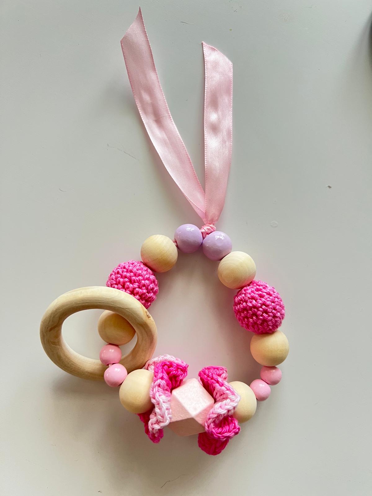 Dona sollievo al tuo bimbo con Fiocco di Zucchero, il massaggiagengive artigianale creato con amore per accompagnare la crescita nei primi mesi di vita. Le perle in legno levigato e le sfere in cotone lavorato a mano stimolano il tatto, mentre il design colorato incuriosisce la vista e l’esplorazione.